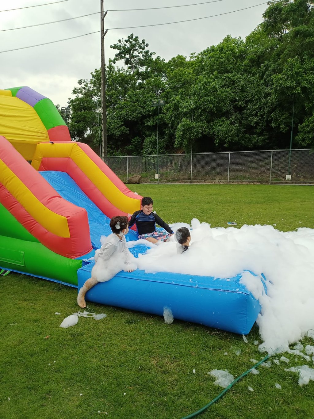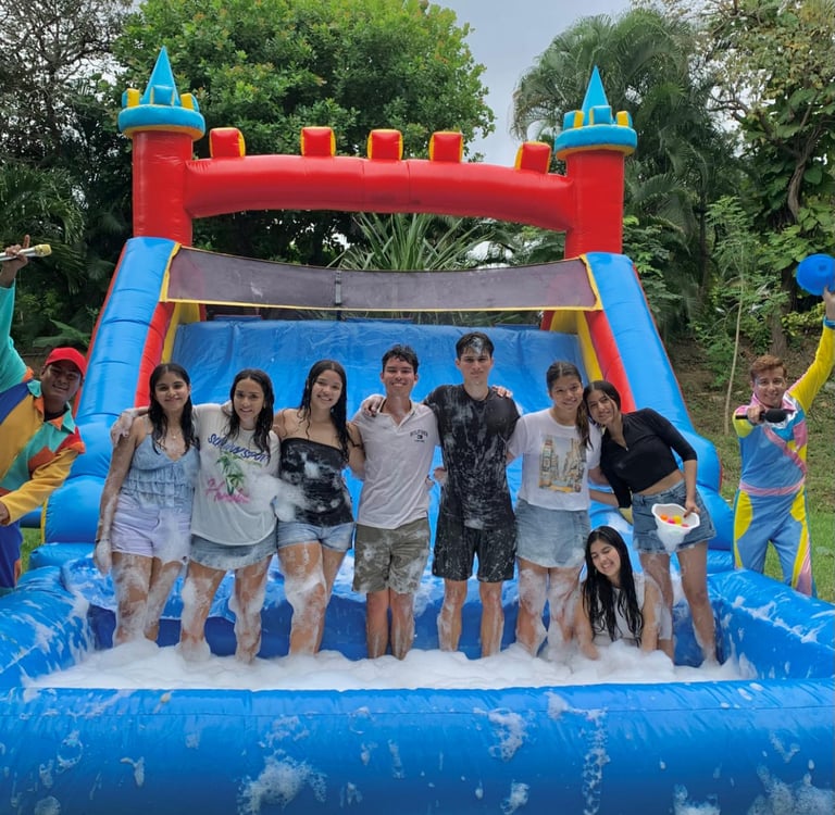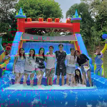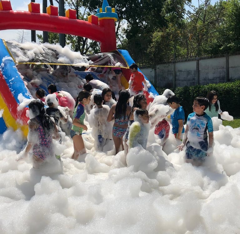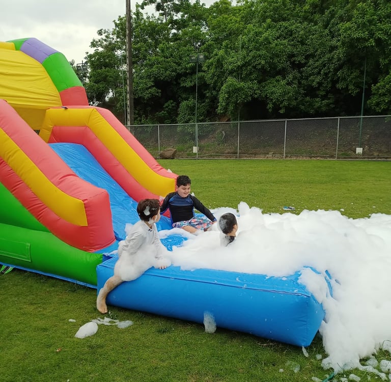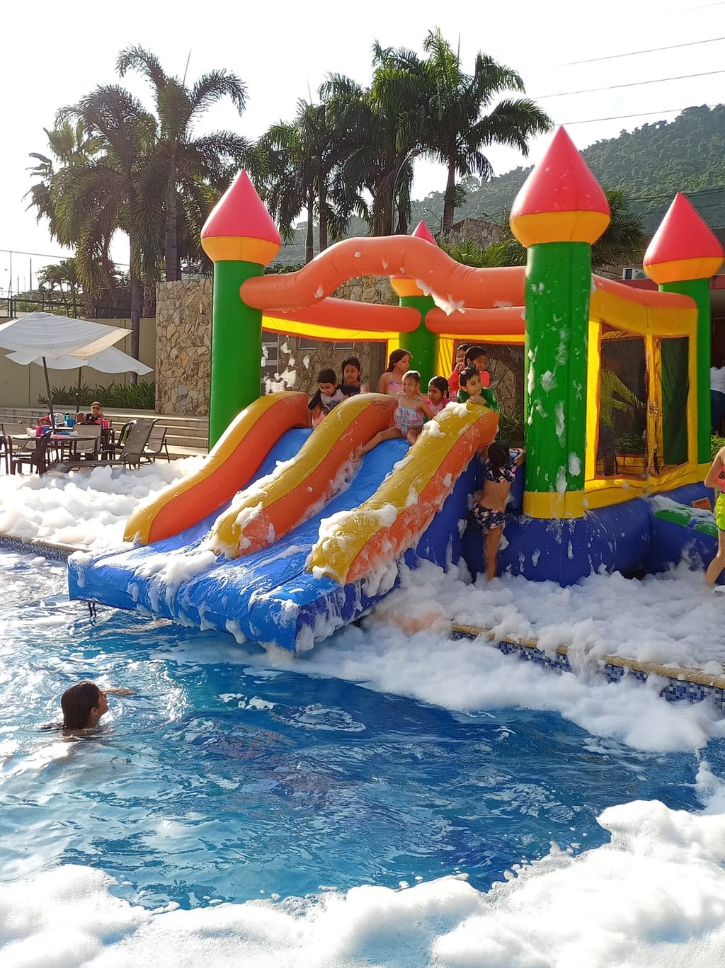 La mejor combinación en tu fiesta en piscina es el Cañón de espuma + Tobogán Triple Slide.