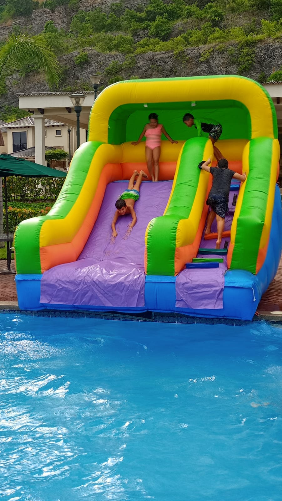 Tobogán con Piscina incluida, tiene columna de escalones frontales para subir hacia las resbaladeras, Ideal para niños y adultos.