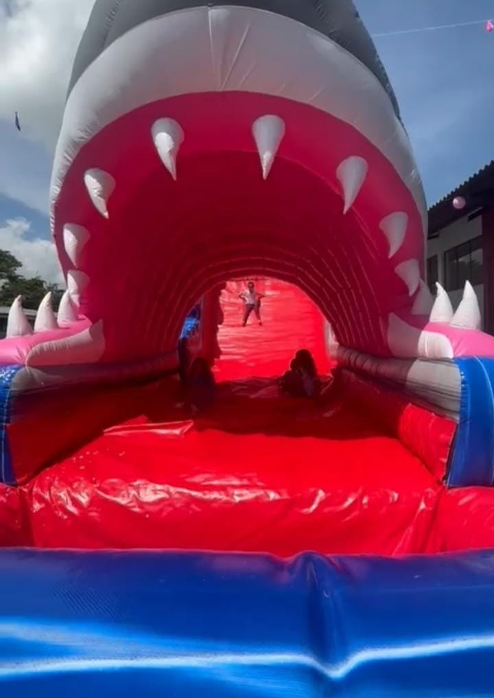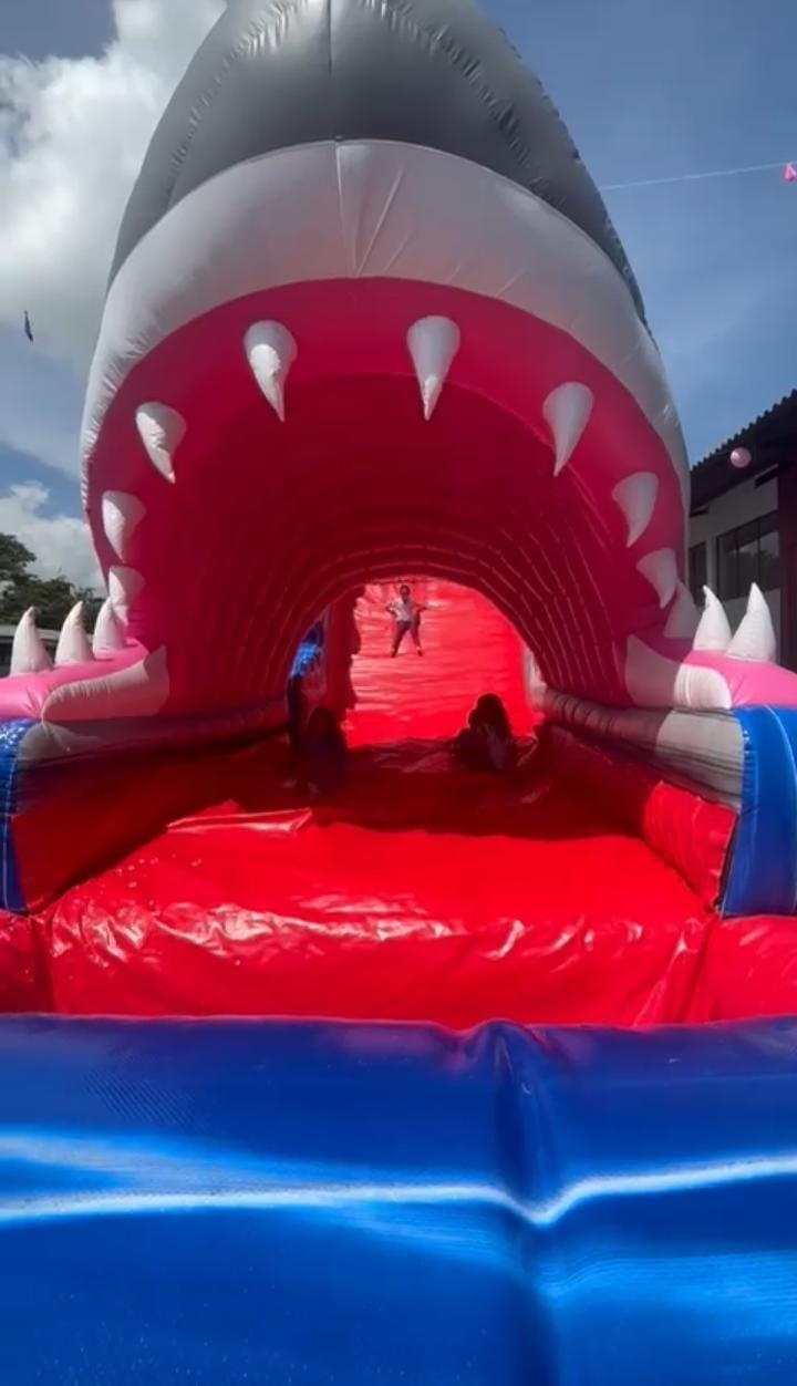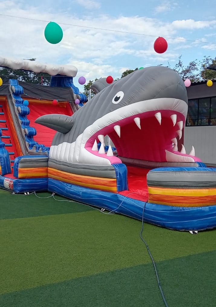 Divertido inflable temático de Tiburón que combina una resbaladera con piscina incorporada para máxima diversión.